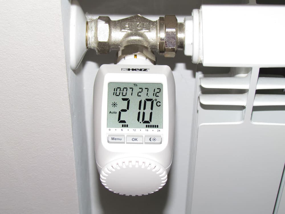Электронные устройства работают от батареек, которые можно подзаряжать. Владельцу жилья нужно запрограммировать термостат на поддержание желаемой температуры, и специальный датчик будет регулировать её в течение всего сезона. Самый простой электровариант – прибор, который похож на механический, но отличается от него наличием дисплея. Для его функционирования достаточно указать диапазон колебания температур или выставить точный показатель, который будет всё время поддерживаться.