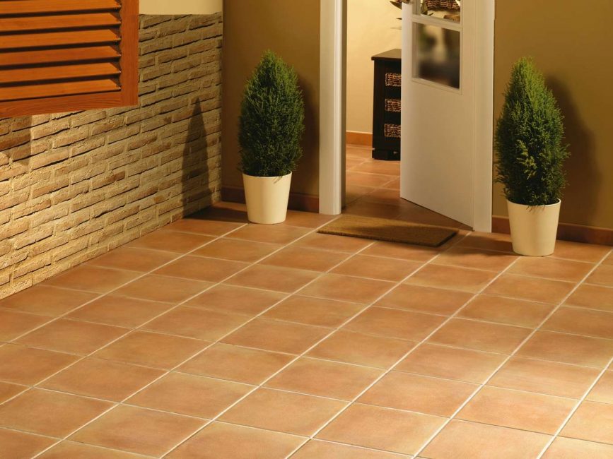 Плиточные покрытия широко используются для отделки ванной и кухни на полу, стенах, кухонном фартуке. Неплохо подходит терракотовая плитка для двора, отделки веранд, террас, открытых площадок. В прихожих нередко монтируют комбинированный пол, сочетающий теплые тона керамической плитки и натуральное дерево, паркет, ламинат древесных оттенков. Классическим вариантом считается квадратная или прямоугольная плитка. Также в магазинах можно встретить более необычные виды отделки: например, шестигранники, ромбы, «соты», лепестки и треугольники из керамики.