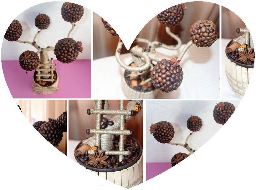 Не бойтесь экспериментировать и проявлять собственную фантазию, когда будете делать кофейное дерево. Есть много разных вариаций топиариев, приведем некоторые стильные идеи для поделок.