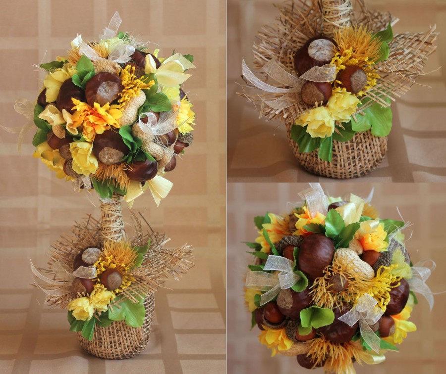 Существуют различные варианты поделок. Особо популярны комнатные топиарии. Декоративные модели с оригинальной кроной, сделанные мастерицами, станут прекрасным подарком к празднику или иному торжеству. Так, можно смастерить мини-деревце счастья, создать топиарий к Новому году или изготовить денежное дерево. В последние годы такие поделки нередко используют в качестве свадебного декора.
