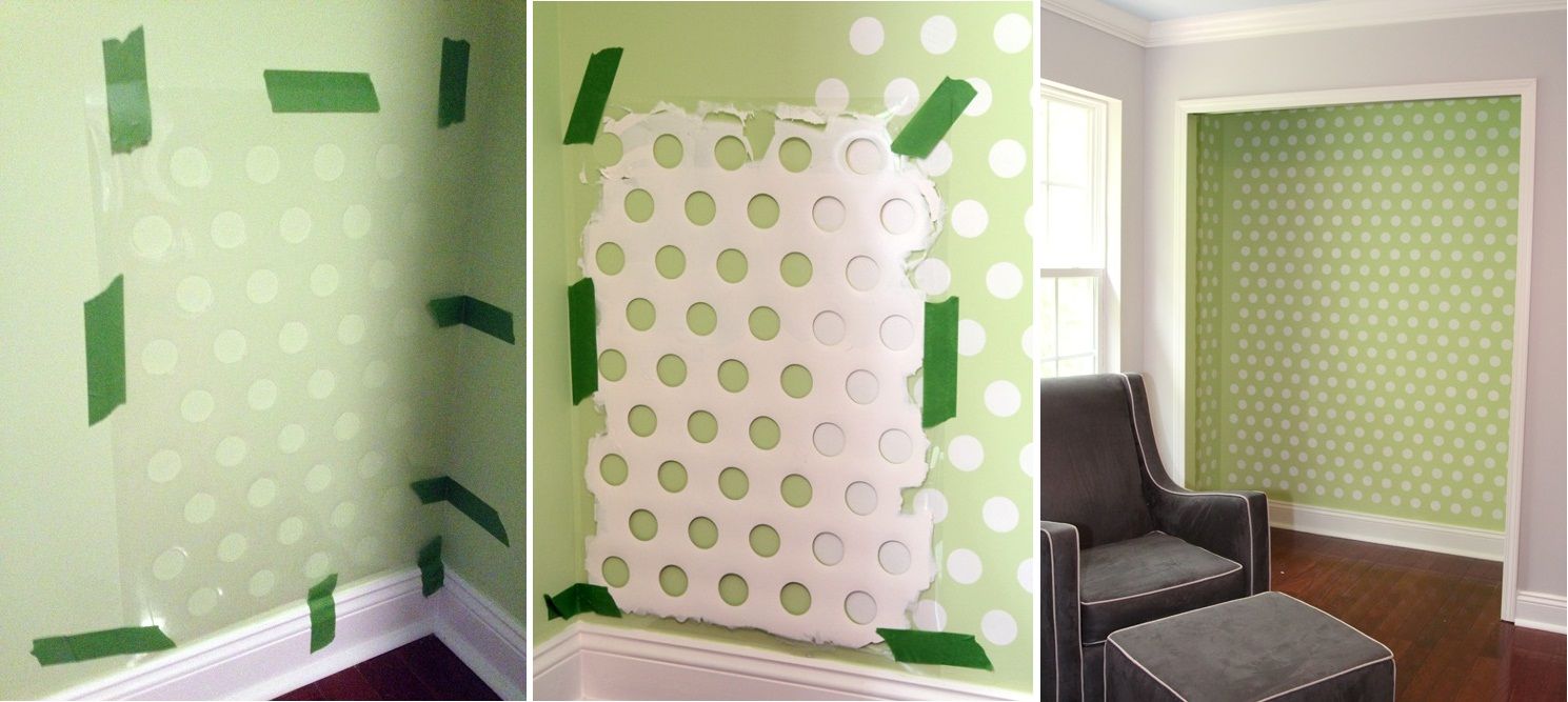 - Трафарет снимают со стены сразу после нанесения краски. При многоразовом использовании не забудьте его вытереть, только потом используйте снова. При нанесении шпатлевки, наоборот, оставьте трафарет до высыхания.