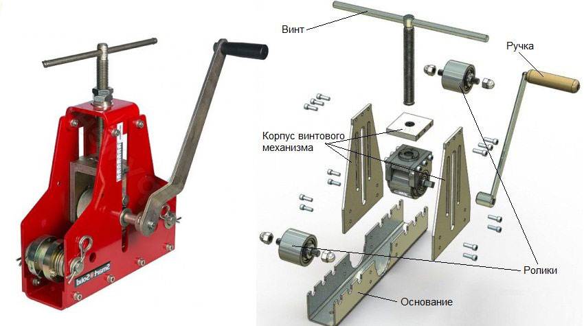 Направляющие и нажимные. Труба проходит сквозь подвижных элементов, степень изгиба задается усилием прижимного ролика. Если радиус кривизны готового изделия получился мал, процедуру следует повторить.