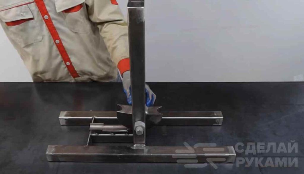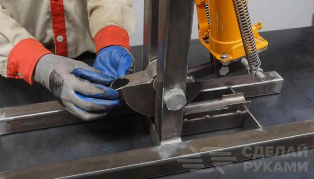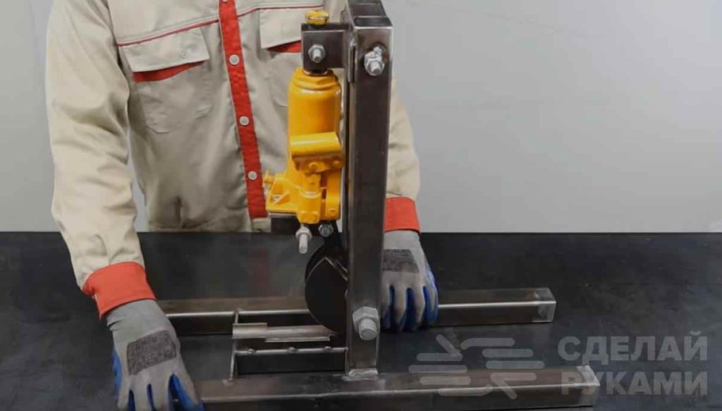 Разместить снизу домкрат под направляющей платформой, с помощью болтов надежно закрепить на основании и самодельный трубогиб готов к работе.