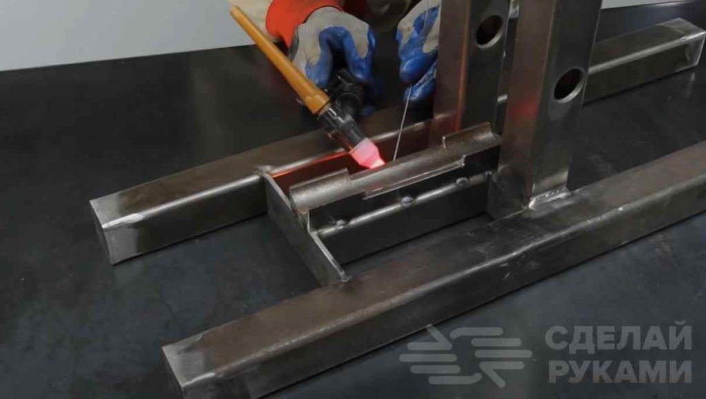 На следующем этапе из профильной трубы мастер сваривает станину для трубогибочного станка. К основанию станины приваривается направляющая для круглой стальной трубы.