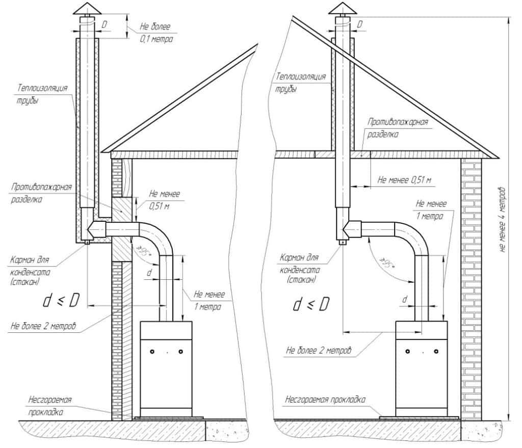 В случае самостоятельной установки конструкции нужно помнить про прохождения через стены, дом, перекрытия. При отсутствии изоляции и выполнении каналов из нержавеющей стали, трубы должны находиться на расстоянии как минимум один метр от перекрытия.