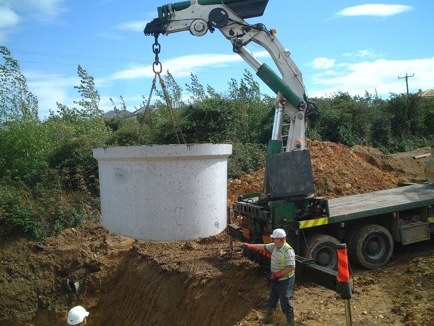 В каждую из ям при помощи специальной техники устанавливается по три бетонных кольца. Щели между ними заполняют специальной гидрофобной смесью, а оставшуюся полость между землей и кольцом.