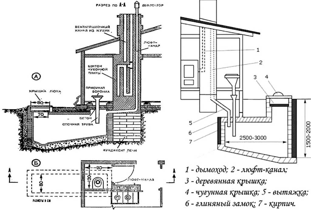Рис. 3. 1 – дымоход; 2 – люфт-канал; 3 – утеплённая крышка; 4 – стандартный канализационный люк; 5 – вентиляционная труба; 6 – глиняный замок; 7 – кирпичные стены.