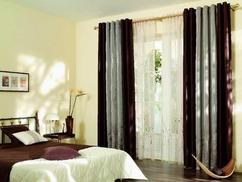Коричневая вуаль не петлях — отличный вариант для спальни с балконом