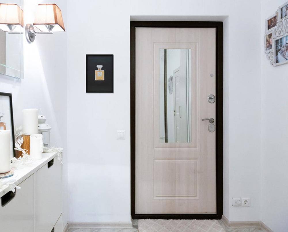 Зеркало на входной двери крепят при недостатке свободного пространства. Подобное решение подходит для узких и маленьких коридоров, обеспечивает визуальный эффект расширения помещения.