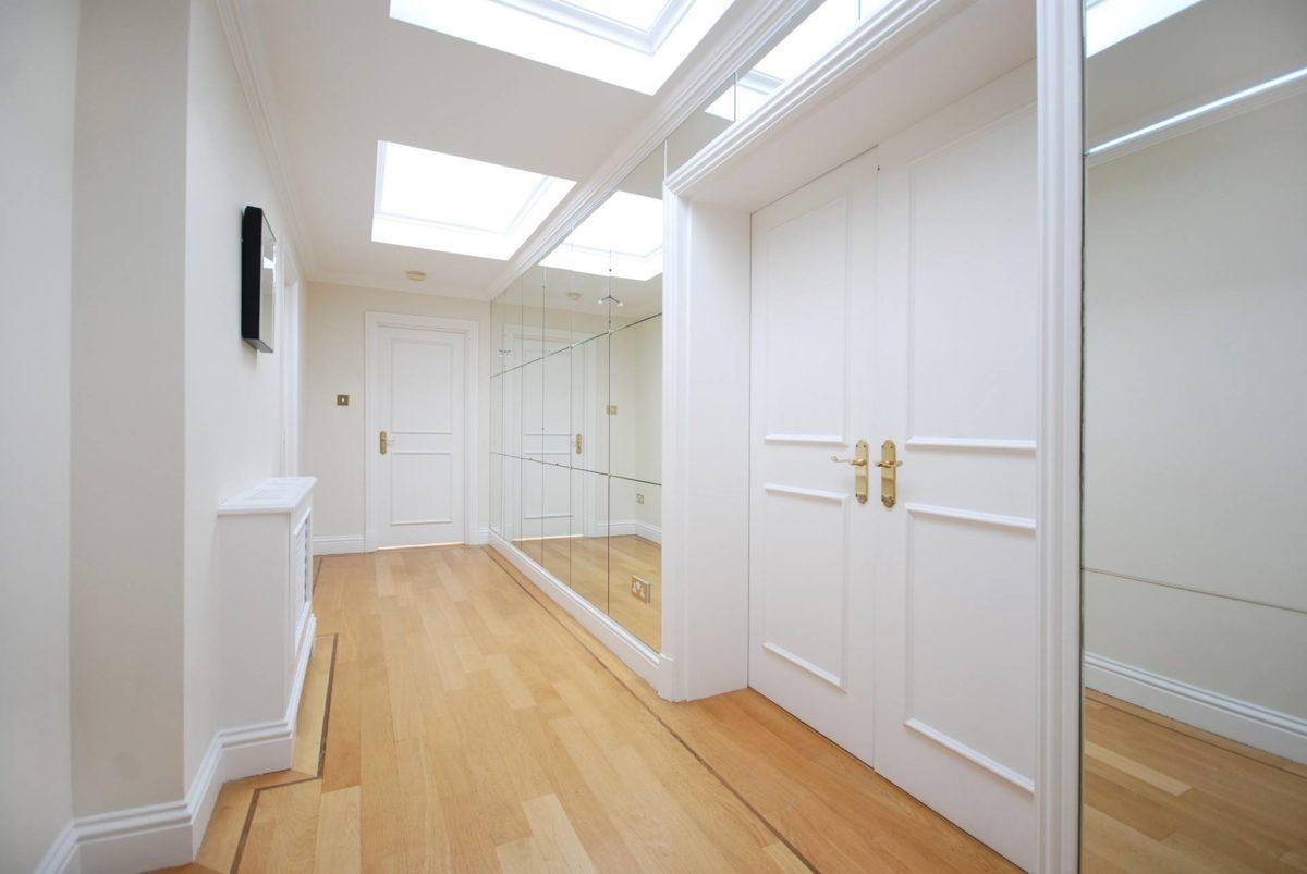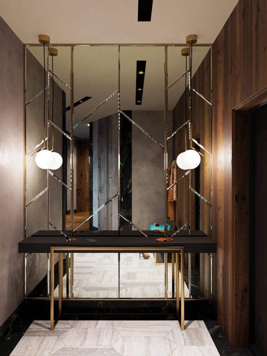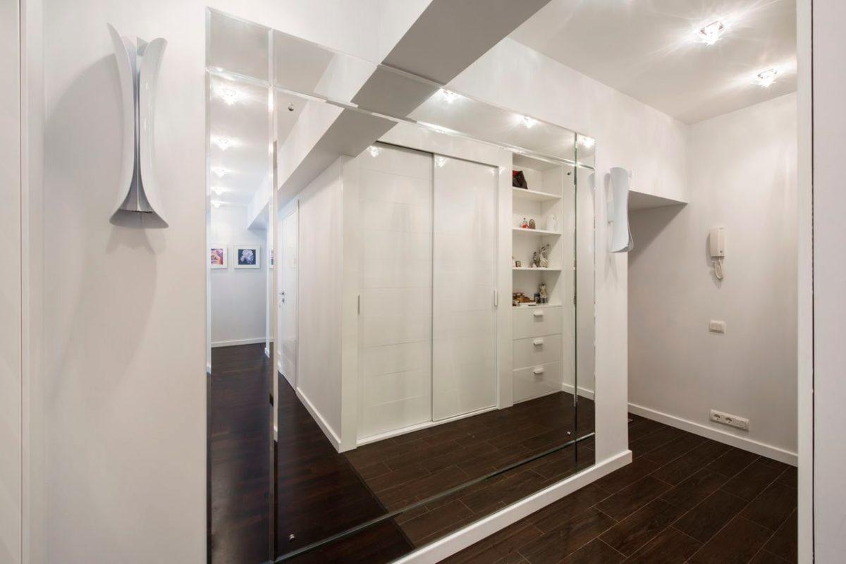 Зеркальное полотно, занимающее весь простенок от пола до потолка, предполагает достаточно свободной площади в прихожей. Подобную конструкцию дополняют качественным освещением, чтобы наполнить помещение светом, воздухом, сделать его зрительно больше.