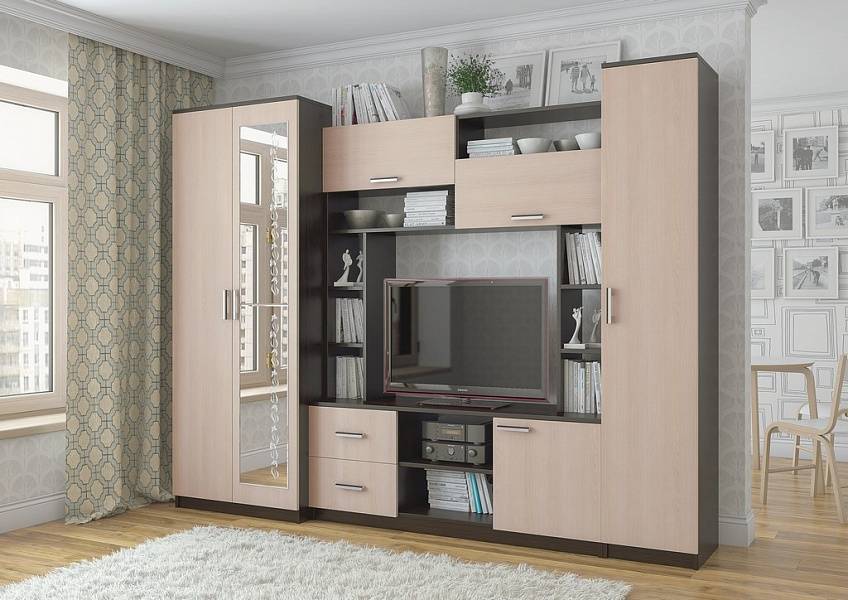 В этом случае важно подбирать предметы так, чтобы рационально использовать пространство. Поскольку стенка в гостиную приобретается не на один год, немаловажным критерием является баланс цены и качества