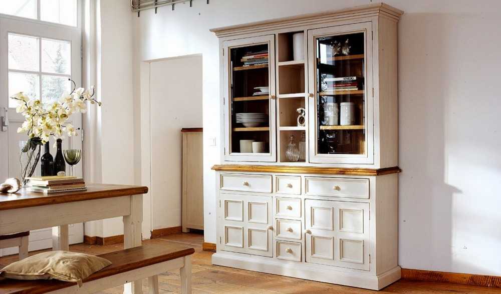 В кантри хорошо смотрится только шкаф-витрина в виде комода, обязательно из массива дерева с самым обычным стеклом. Никакого антибликового эффекта, витражей, цветного или матового стекла: исключительно стандартное, прозрачное.