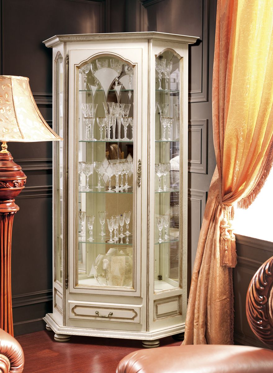 Шкаф-витрина, подходящий для классического стиля, это обязательно комод с обычным прозрачным стеклом, из массива дерева. Декорировать его нужно сообразно особенностям окружающей обстановки: для отсылок к барокко подойдет золоченая резьба и гнутые ножки, для готики – черный цвет и отсутствие бросающегося в глаза декора, для английской классики — внушительные размеры и обязательно книги внутри.