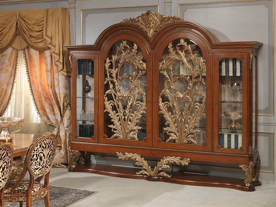 Дорогая витрина из ценной породы дерева с красивым декором – прерогатива классических интерьеров