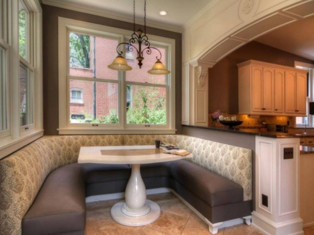Угловая модель – это наиболее подходящий вариант. Разместить диван в маленькой кухне вы можете в свободном углу. Благодаря этому сэкономите немного пространства и сможете поместить больше людей в обеденной зоне.