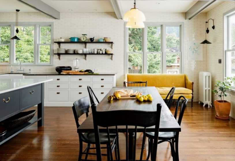 Также можно посмотреть на малогабаритные диваны для кухни, которые не имеют функции раскладывания, зато могут разместить много людей и вместить в себя много кухонной утвари. Диван-скамья хоть и простой, но выглядит достаточно эффектно. Чтобы выделить его как-то можно в дополнение купить яркие подушки.