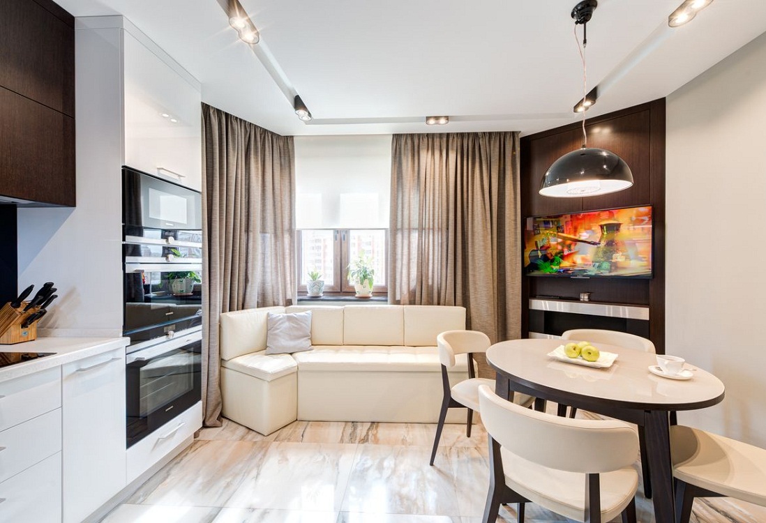 Модульная конструкция подойдет, если вам нужно расставить мягкую мебель в разных местах. Такие диванчики имеют встроенные мини-бары, отсеки для хранения редко используемых кухонных приборов. Здесь важна прочность каркаса, так как некачественный диванчик не прослужит вам долго.