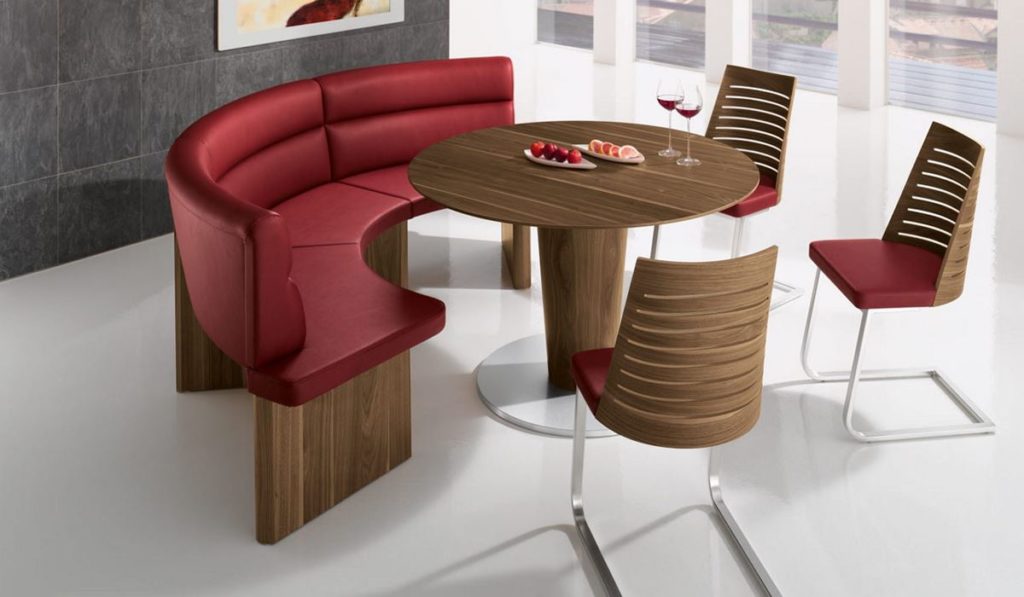 Замечательно впишется в интерьер и полукруглая модель. Лучше всего в малогабаритное помещение заказывать не раскладной диванчик, а обычный. Он имеет вместительные ящики под сиденьями и полочки.
