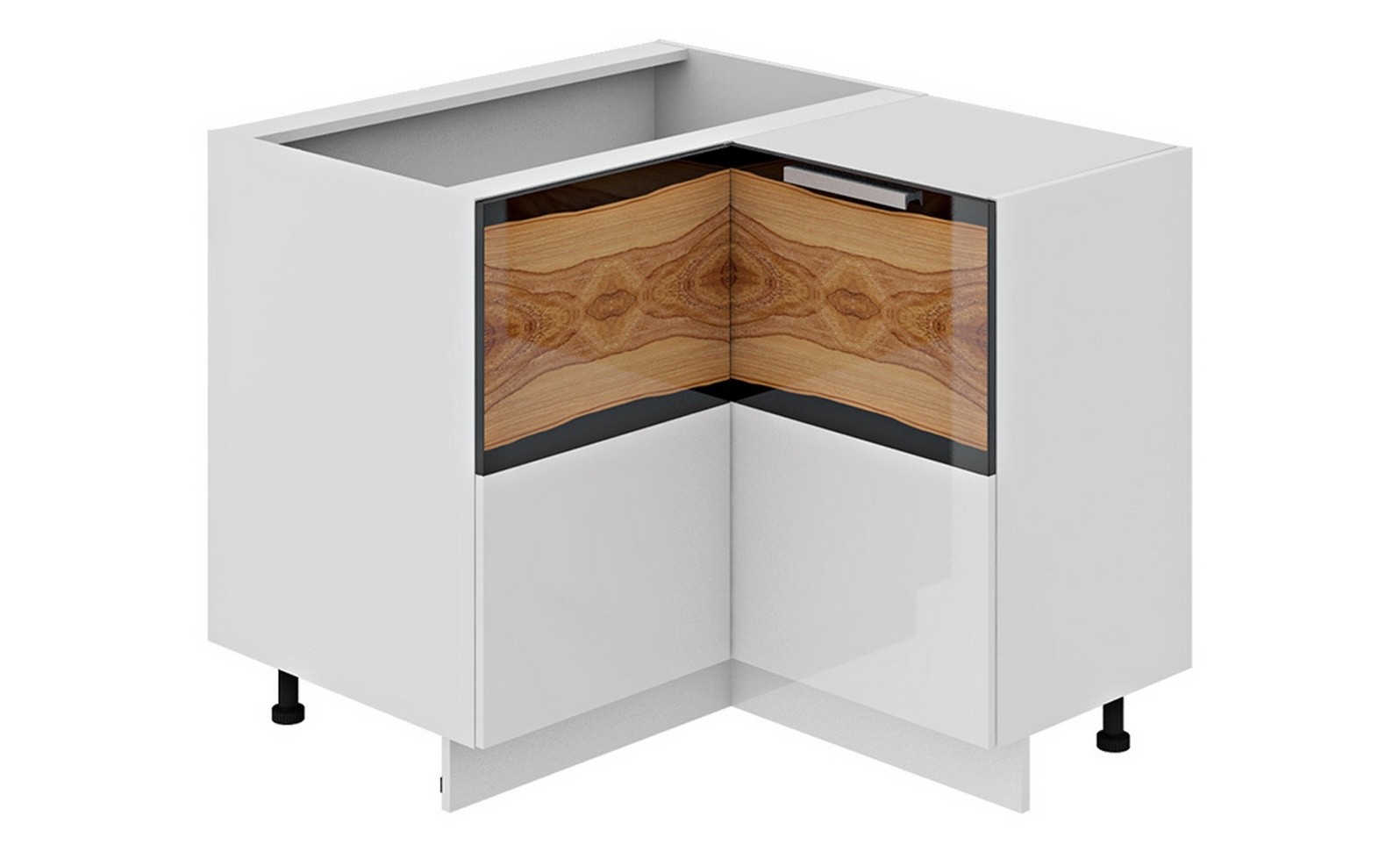 Вариант, который используется для создания кухонь под углом в 90 градусов. Выглядит это так: две напольных тумбы фиксируются между собой при помощи небольшой декоративной планки, скрывающей пустоту. Эти тумбы могут выполнять самые различные функции: выдвижные ящики и корзины, жесткие полки и хранение мусорного ведра.