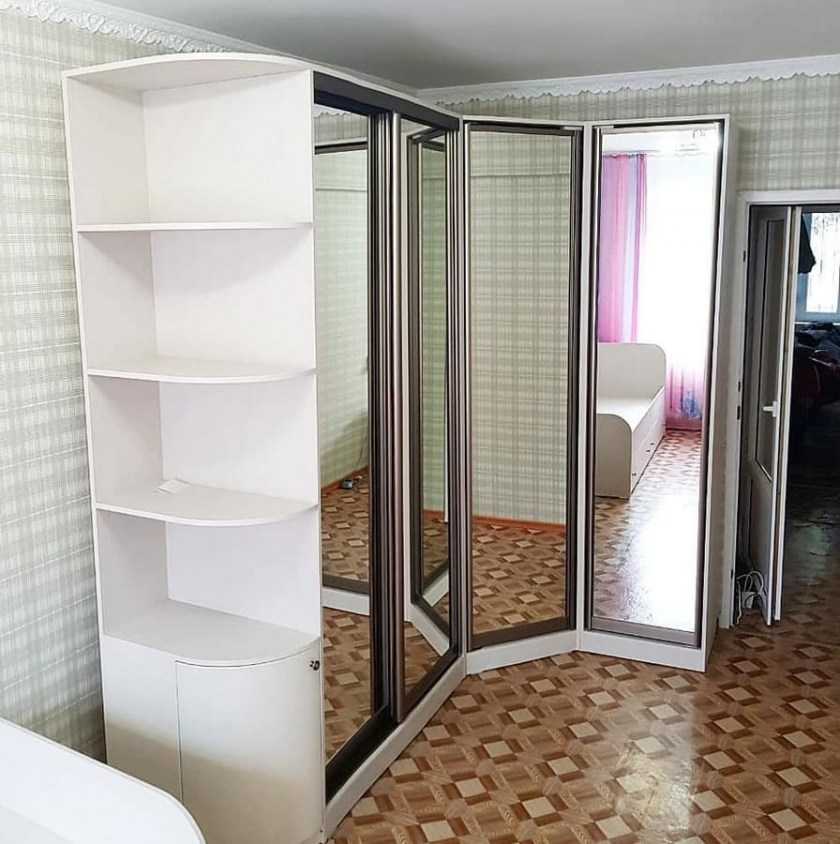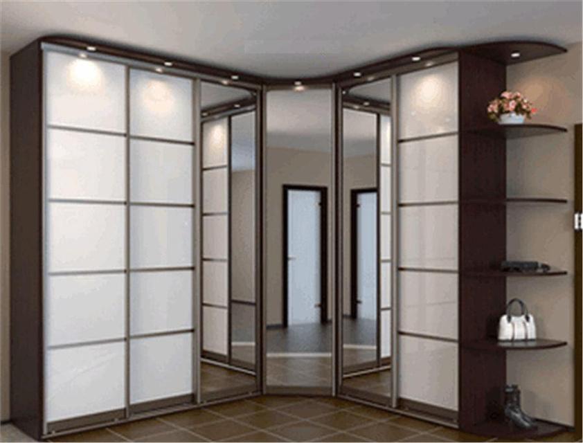 Одной из разновидностей треугольной формы является радиусный шкаф купе угловой. Его своеобразная конфигурация заключается в особой конструкции двери, имеющей закругленную форму, которую обеспечивают направляющие. Такой шкаф может иметь выпуклые, вогнутые или волнообразные двери.