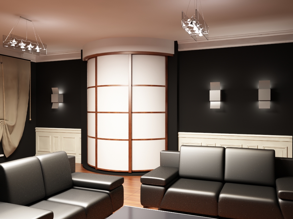 В отличие от предыдущей модели, радиусные изделия отличаются тем, что их угловая конструкция имеет более закругленный силуэт выпуклого или вогнутого типа. В более габаритных изделиях он может сочетать в себе даже оба этих признака. За счет этого форма шкафа становится волнообразной.