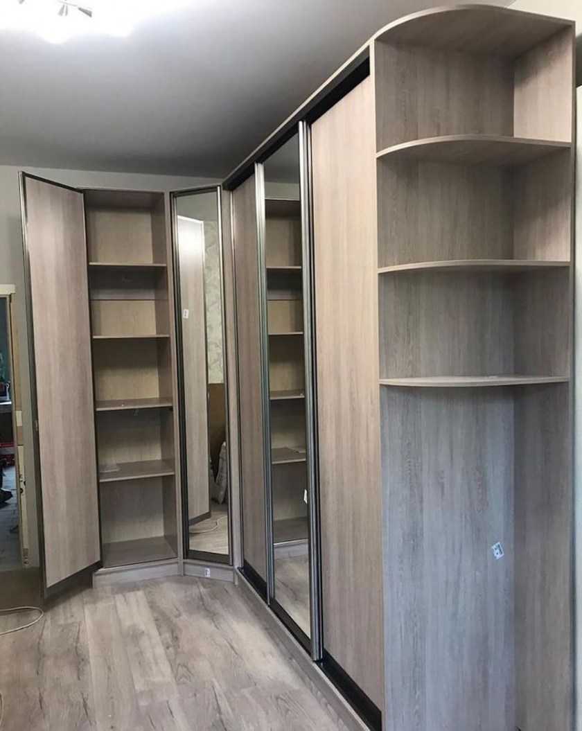 Можно выделить комбинированную форму углового шкафа, позволяющая дополнять и объединять основные виды, чтобы максимально задействовать всю свободную площадь угла и сделать мебель индивидуальной и удобной.