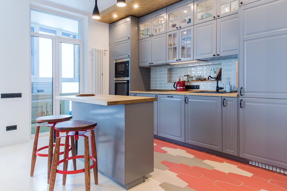 Угловая кухня, имеющая остров, подойдет для помещений размером до 15 кв.м. Также это хороший способ зонирования пространства. Такая планировка имеет свои плюсы: