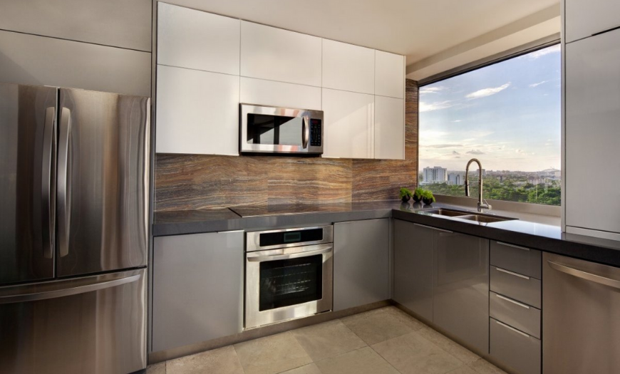 Если правильно спланировать П-образную кухню, то она будет вместительной и практичной. Такой вариант подразумевает расположение мебели и бытовой техники вдоль смежных стен. В маленьких кухнях дизайнеры предлагают установить вдоль одной из боковин гарнитура полуостров или барную стойку.