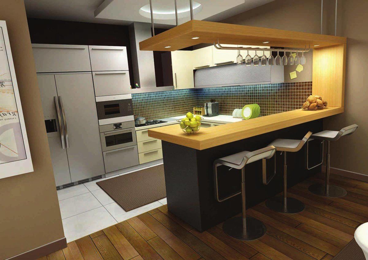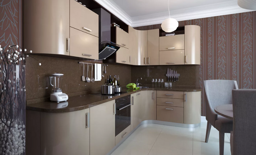 В 2022 году будет актуальным дизайн маленькой угловой кухни с полукруглой барной стойкой. Она может заменить полноценный обеденный стол. Внизу полукруглой барной стойки располагают функциональные шкафы.