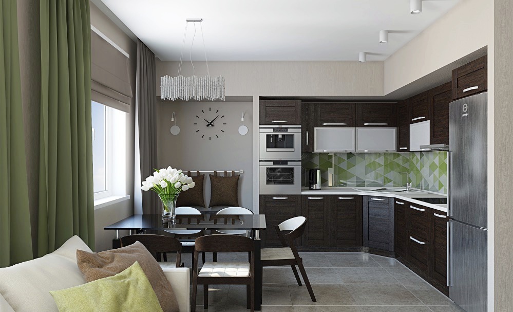 Дизайнеры часто используют светлые тона в маленьких комнатах. Также, если соблюсти одну цветовую гамму в отделке и гарнитуре, то получится создать единое пространство.