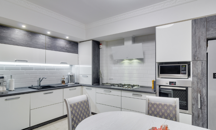 При такой оформлении шкафы располагаются под прямым углом. Подобный вариант подойдет для небольших или смежных кухонь. Преимущества Г-образной угловой планировки в 2022 году: