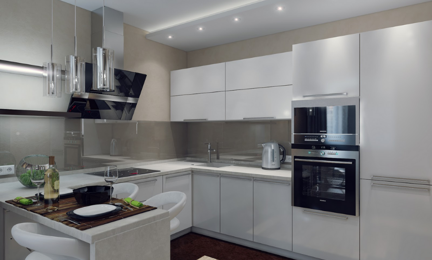 Для небольшого помещения хорошим вариантом меблировки будет угловая кухня с пристроенной барной стойкой. Она не занимает много места и выглядит невесомо. Нередко под баром размещают отсеки для хранения посуды.