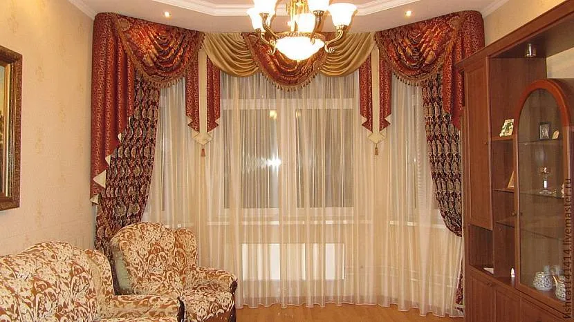 В помещениях с высокими потолками и большими окнами, можно дать волю фантазии, и повесить многослойный вариант. Такая композиция будет центром и украшением комнаты. Это может быть тюль с портьерами и ламбрекеном.