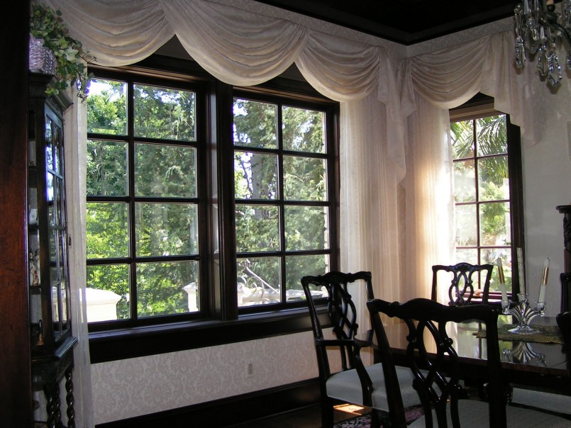 Для штор на большое угловое окно следует приобретать особые карнизы. Если просто составить обычные карнизы встык, то со временем они по разным причинам могут перекоситься и оказаться на разной высоте. Шторы также перекосятся, что будет достаточно заметно и красоты не прибавит.