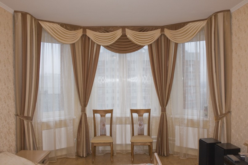 Шторы на эркер для гостиной располагают над каждым окном отдельным полотном на общем карнизе с ограничительными кольцами, шторы на внешних углах общие на весь эркер. Для гостиной подойдут пышные шторы с необычной отделкой.