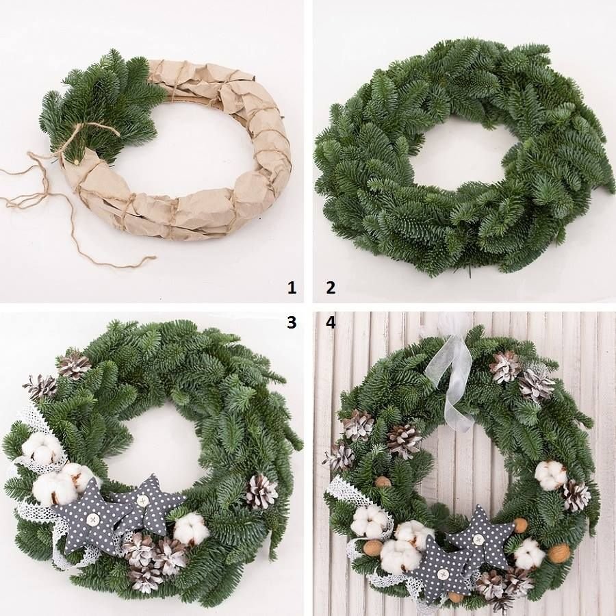 - Каркас делаем из проволоки и еловых веток. Накладываем одну на другую, скрепляем проволокой или плотными нитками.