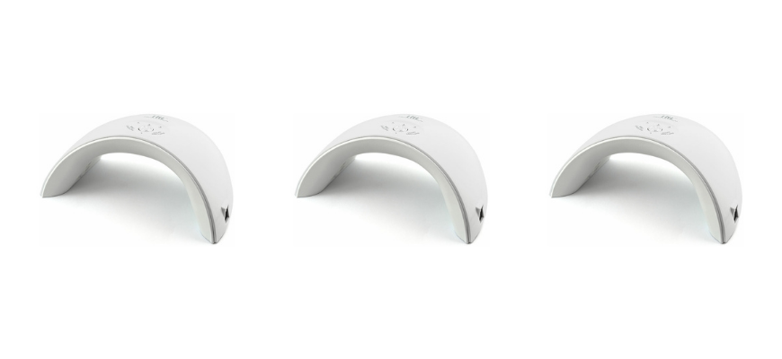 Дугообразная модель гибридного типа продаётся в двух цветах – белый и золото. Она не имеет нижней планки, поэтому хорошо подходит для педикюра. Корпус сделан из качественного пластика, который не издаёт неприятных запахов. Лампа справляется со всеми видами стойких покрытий, включая биогель. Время сушки сокращено в 2 раза, так как производитель использовал инновационную технологию двойного источника света. Излучение безопасно для глаз и кожи.