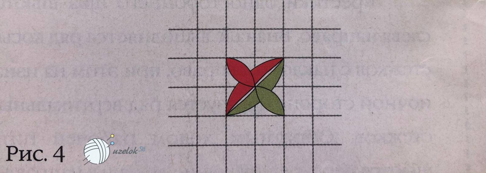Такая маленькая цветная клетка, занимающая четвертую часть квадрата на схеме, соответствует 3/4 стежка крест. Для его выполнения вначале вышейте половину стежка обычным способом, а второй диагональный стежок начните от соседнего угла и закончите его в середине клетки. Таким же образом заполните вторую половину клетки нитками другого цвета (рис. 4).