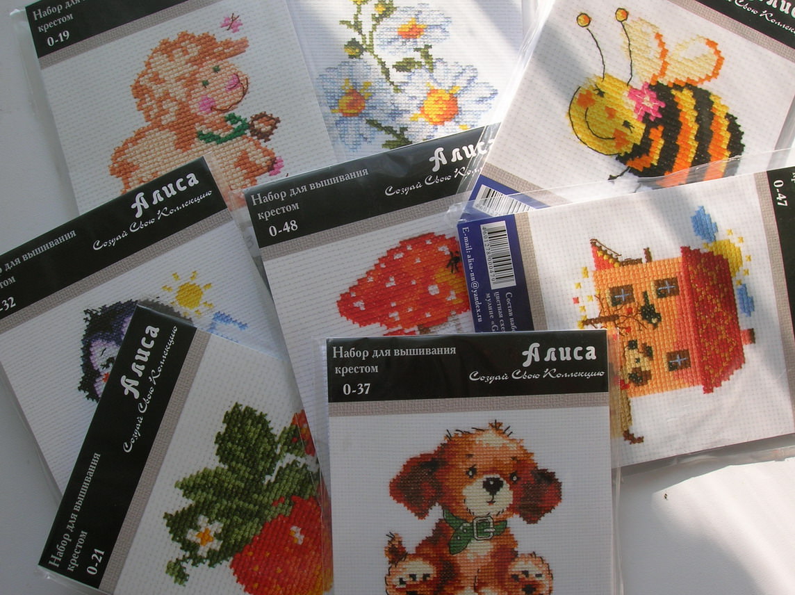Готовые наборы для новичков можно купить в специализированных магазинах или онлайн. Наборы для начинающих мастериц содержат схему с простыми сюжетами. Размеры таких картин небольшие, что позволяет выполнить вышивку легко и быстро.