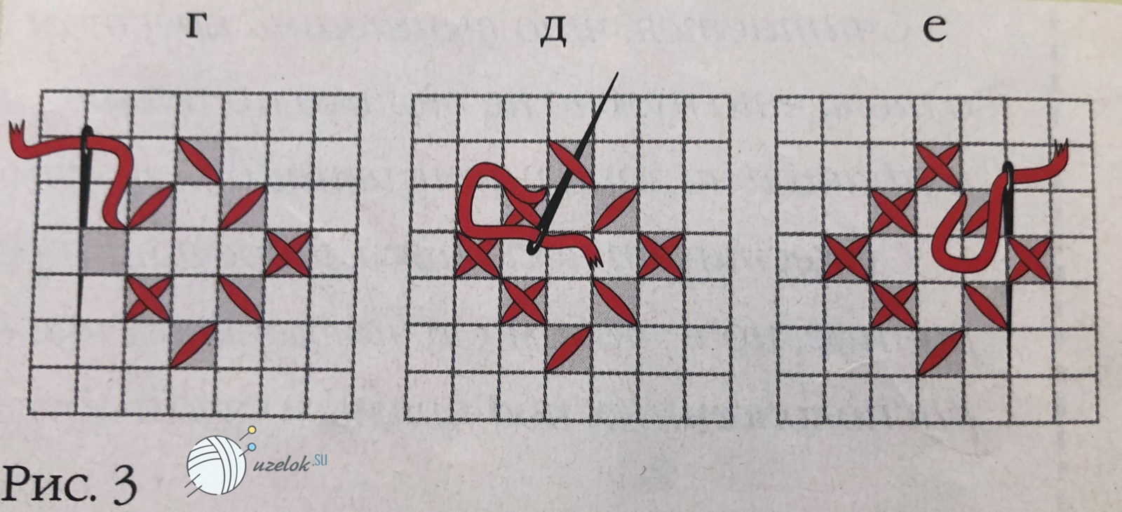 Крестики в следующих рядах выполняем так же, как и в предыдущих. Вышив крестик в пятом ряду, обратным ходом заполняем такими же пересекающими стежками весь фрагмент (рис. 2 д, е).