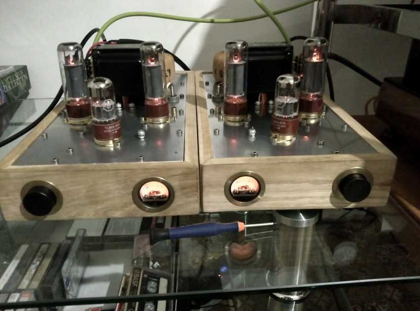 Во времена технического прогресса, когда смартсфоны уже настолько тонкие, что ими можно блины на сковороде переворачивать, а на телевизорах ну никак не могут с комфортом покемарить няшные котейки, я решил сотворить ламповый усилитель в максимально возможном тонком корпусе. Набравшись уже достаточно опыта в лампостроении и, выпрямив руки до нужной кондиции, я решил выйти на новую планку качества в схематехническом и дизайнерском планах. Придумывать свою схему я не стал, а просто взял наработку из интернета под названием «Покемон». Схема в стерео варианте, состоящая из одной лампы 6Н23П в раскачке и двух оконечных 6П14П. Мощность 4,3 Ватта в канале. Вся схема разведена мною на одной моноплате. Блок питания и выходные трансформаторы на печатном монтаже. Лишь сетевые трансформаторы вынесены за экран. Корпус высотой 45 мм. С защитными стойками для ламп. На передней панели стерео гнездо 6,3, две ручки громкости и два индикатора мощности. Индикаторы были мною переделаны из советских амперметров путём замены шкалы и сборки схемы измерения мощности. Фон выведен в полный ноль. Если при нулевом сигнале выкрутить потенциометры на максимальную мощность и прислонить ухо к резонатору динамика, не будет слышно ровно никаких гудений, свистов и посторонних призвуков. Подобный эффект достигнут сверхнадёжной схемой питания и глухой экранировкой питающих трансформаторов. Усилитель собирал в течение 3 месяцев и меня удовлетворил по всем параметрам. Если раньше я писал, что сборка ламповых усилителей и гитарных ламповых эффектов мне почти перестала доставлять удовольствие, то в этом случае результат меня «прёт что надо». К чему можно подключить этот девайс? — Компьютеру. Кабелем 3,5 на 6,3. — К виниловому проигрывателю со встроенным предусилителем. — К гитаре. Да-да, как гитарный девайс он тоже хорош. Частота межкаскадными емкостями не зажата, что просто шикарно для подключения гитары, или связки гитара + примочка. Единственный нюанс – нужно подключать вместо широкополосок гитарные 4 Ом,ные динамики (или один динамик а на второй выход вешать эквивалент нагрузки чтобы не спалить выходные трансформаторы).