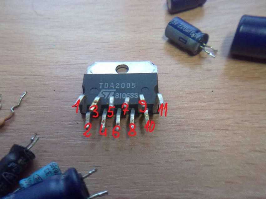 Простая схема низкочастотного блока большой мощности может быть собрана на нескольких типах интегральных микросхем, но нумерация выводов не меняется. Выходная мощность (W) соответствует следующим типам микросхем: