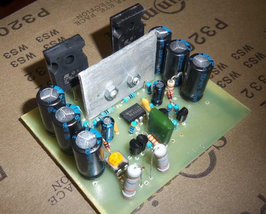 Обычно проще сначала припаять меньшие компоненты, а затем перейти к более крупным деталям. Вот один канал усилителя НЧ после пайки компонентов: