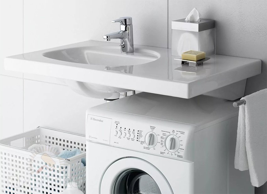 Раковина над стиральной машиной со смещенным назад сливным отверстием