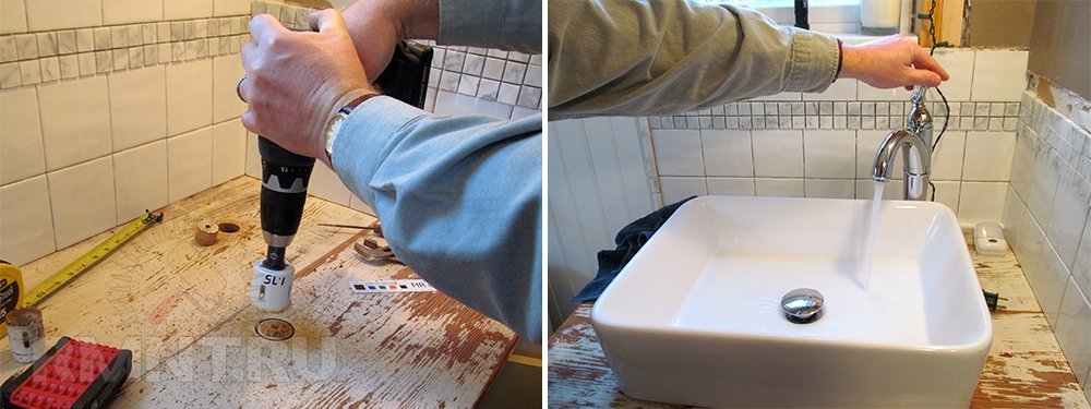 В обоих случаях в столешнице придётся вырезать отверстие для прохода сливной горловины, а для врезных раковин — для скрытия наружных стенок чаши. Разница лишь в том, что для накладных раковин отверстие можно просверлить коронкой, оно редко бывает больше 70 мм.