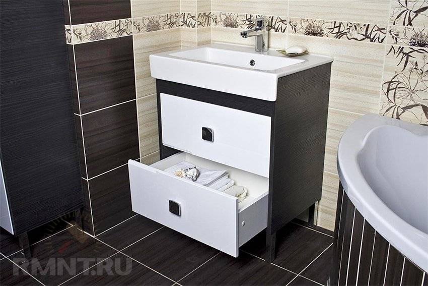 Так называемый мойдодыр — это название объединяет множество разновидностей раковин, которые выполнены в виде небольшого шкафа с чашей в верхней части. Вместо самого шкафа может устанавливаться металлический каркас. Преимущество таких раковин в том, что они могут быть в кратчайшие сроки демонтированы и перемещены в сборе, плюс под чашей имеется обустроенное место для хранения бытовой химии.