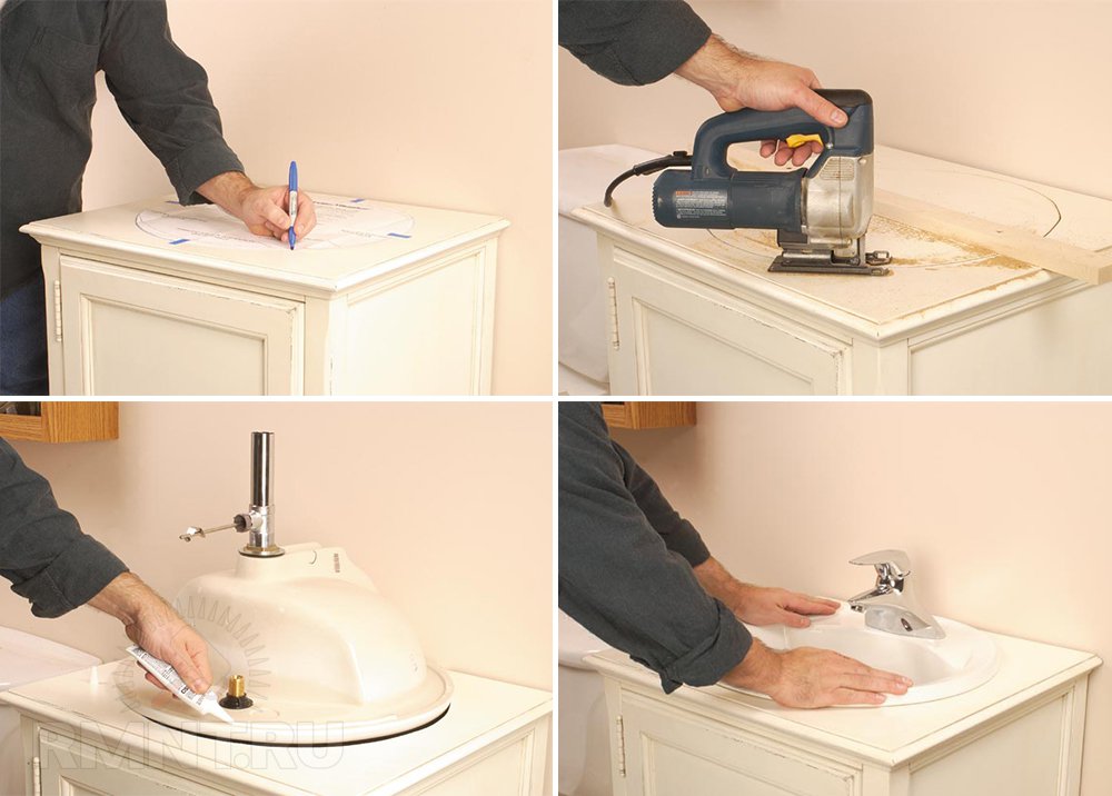 После того как в столешнице изготовлен проём, чашу ставят на место и герметизируют примыкание санитарным силиконом. Как правило, раковина держится за счёт собственного веса и, в отличие от кухонной мойки, дополнительного крепежа не имеет.