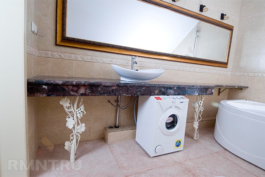 Если положение с местом в ванной или санузле не столь критическое, можно установить раковину над стиральной машиной со столешницей. Машину устанавливают под столешницу. Это вариант с точки зрения электробезопасности наиболее предпочтительный. Есть один минус — раковины со столешницей стоят дорого.