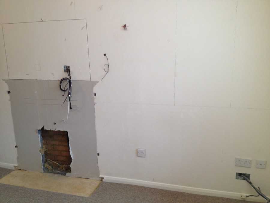 - При установке плит ГКЛ на клей прокладка кабеля осуществляется по штробам, вырезаемым в поверхности, а место для подрозетника выдалбливается.