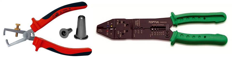 Съемников изоляции, ручных и автоматических, существует много видов. Для ручной работы чаще всего используются съемники-щипцы (на рис. слева) и съемники-клещи, справа на рис. Щипцы необходимо регулировать под провод, что замедляет работу, но для новичка именно они предпочтительнее: